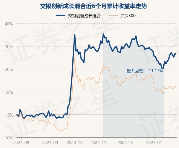 本站消息,1月27日,交银创新成长混合最新单位净值为1.8525元,累计净值为1.8525元,较前一交易日下跌0.3%。历史数据显示该基金近1个月下跌1.75%,近3个月下跌2.14%,近6个月上涨26.43%,近1年上涨29.21%。该基金近6个月的累计收益率走势如下图: